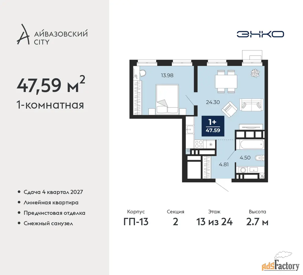 Дом монолитный, многоподъездный, высотой 24 этажа. Квартира находится во 2-й секции в корпусе ГП-13. На этаже 6 квартир. В подъезде 1 пассажирский и 1 грузовой лифт. Окончание строительства - 4 квартал 2027 года. Оформление сделки по договору долевого участия.