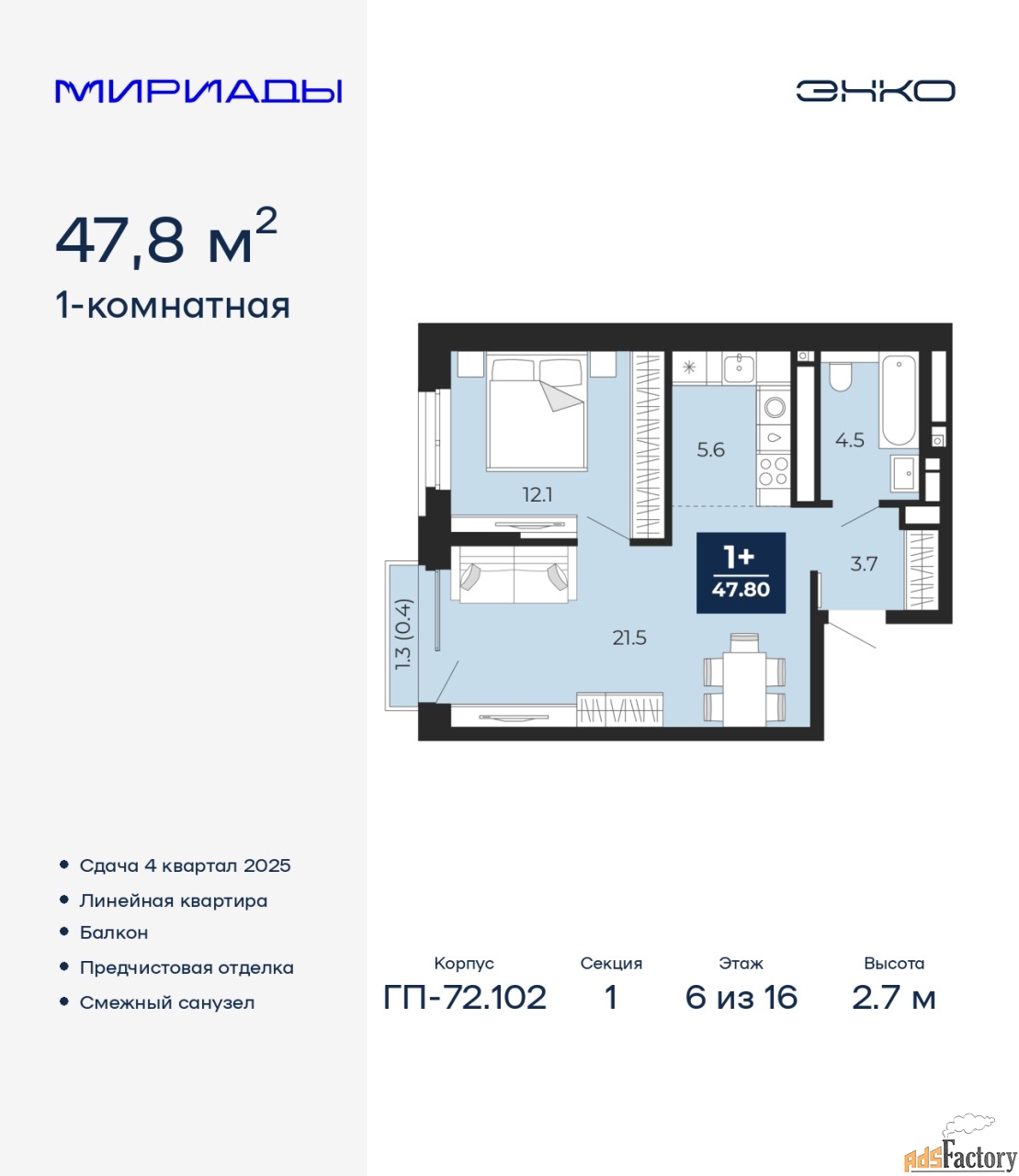 Дом монолитный, многоподъездный, переменной этажности, от 14 до 16 этажей. Квартира находится в 1-й секции высотой 16 этажей в корпусе ГП-72.102. На этаже 9 квартир. В подъезде 1 пассажирский и 1 грузовой лифт. Окончание строительства - 1 квартал 2026 года. Оформление сделки по договору долевого участия.