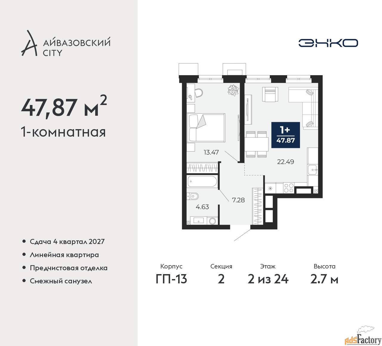 Дом монолитный, многоподъездный, высотой 24 этажа. Квартира находится во 2-й секции в корпусе ГП-13. На этаже 6 квартир. В подъезде 1 пассажирский и 1 грузовой лифт. Окончание строительства - 4 квартал 2027 года. Оформление сделки по договору долевого участия.