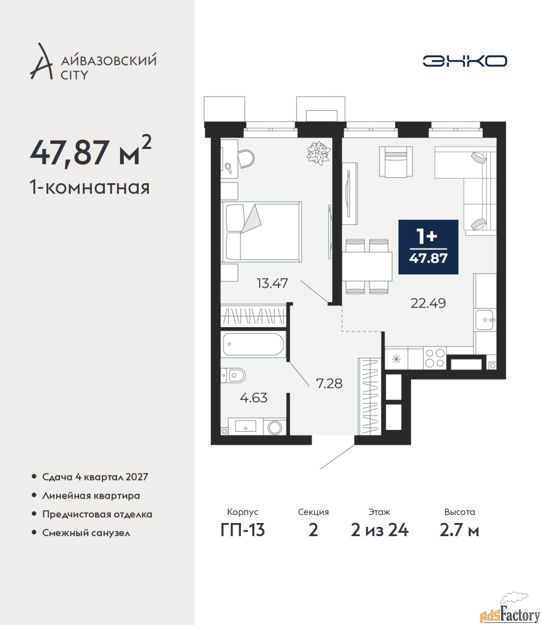 Дом монолитный, многоподъездный, высотой 24 этажа. Квартира находится во 2-й секции в корпусе ГП-13. На этаже 6 квартир. В подъезде 1 пассажирский и 1 грузовой лифт. Окончание строительства - 4 квартал 2027 года. Оформление сделки по договору долевого участия.