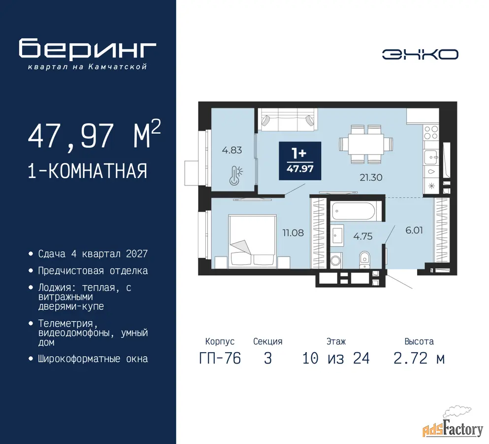 Дом монолитный, черырехподъездный, переменной этажности, от 19 до 24 этажей. Квартира находится в 3-й секции высотой 24 этажа в корпусе ГП-76. На этаже 6 квартир. В подъезде 1 пассажирский и 1 грузовой лифт. Окончание строительства - 4 квартал 2027 года. Оформление сделки по договору долевого участия.