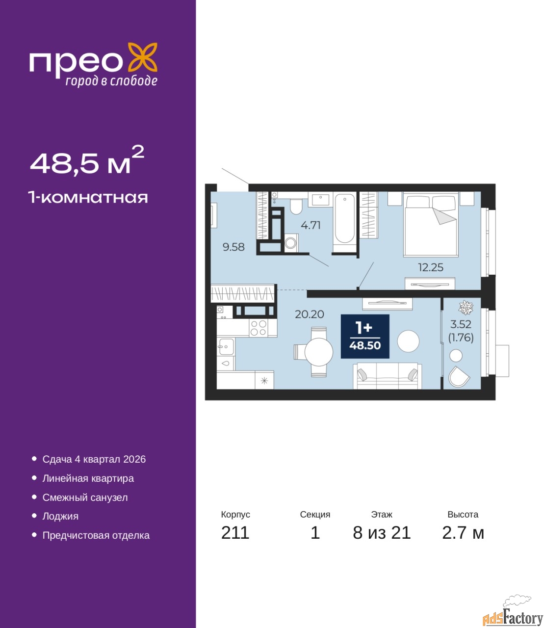 Дом монолитный, черырехподъездный, переменной этажности, от 14 до 21 этажей. Квартира находится в 1-й секции высотой 21 этаж в корпусе 211. На этаже 8 квартир. В подъезде 1 пассажирский и 1 грузовой лифт. Окончание строительства - 4 квартал 2026 года. Оформление сделки по договору долевого участия.