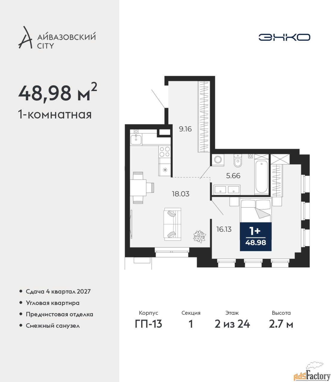 Дом монолитный, многоподъездный, высотой 24 этажа. Квартира находится в 1-й секции в корпусе ГП-13. На этаже 2 квартиры. Окончание строительства - 4 квартал 2027 года. Оформление сделки по договору долевого участия.