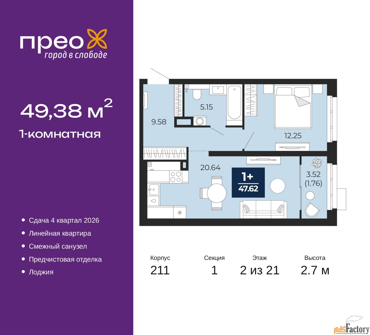 Дом монолитный, черырехподъездный, переменной этажности, от 14 до 21 этажей. Квартира находится в 1-й секции высотой 21 этаж в корпусе 211. На этаже 8 квартир. В подъезде 1 пассажирский и 1 грузовой лифт. Окончание строительства - 4 квартал 2026 года. Оформление сделки по договору долевого участия.