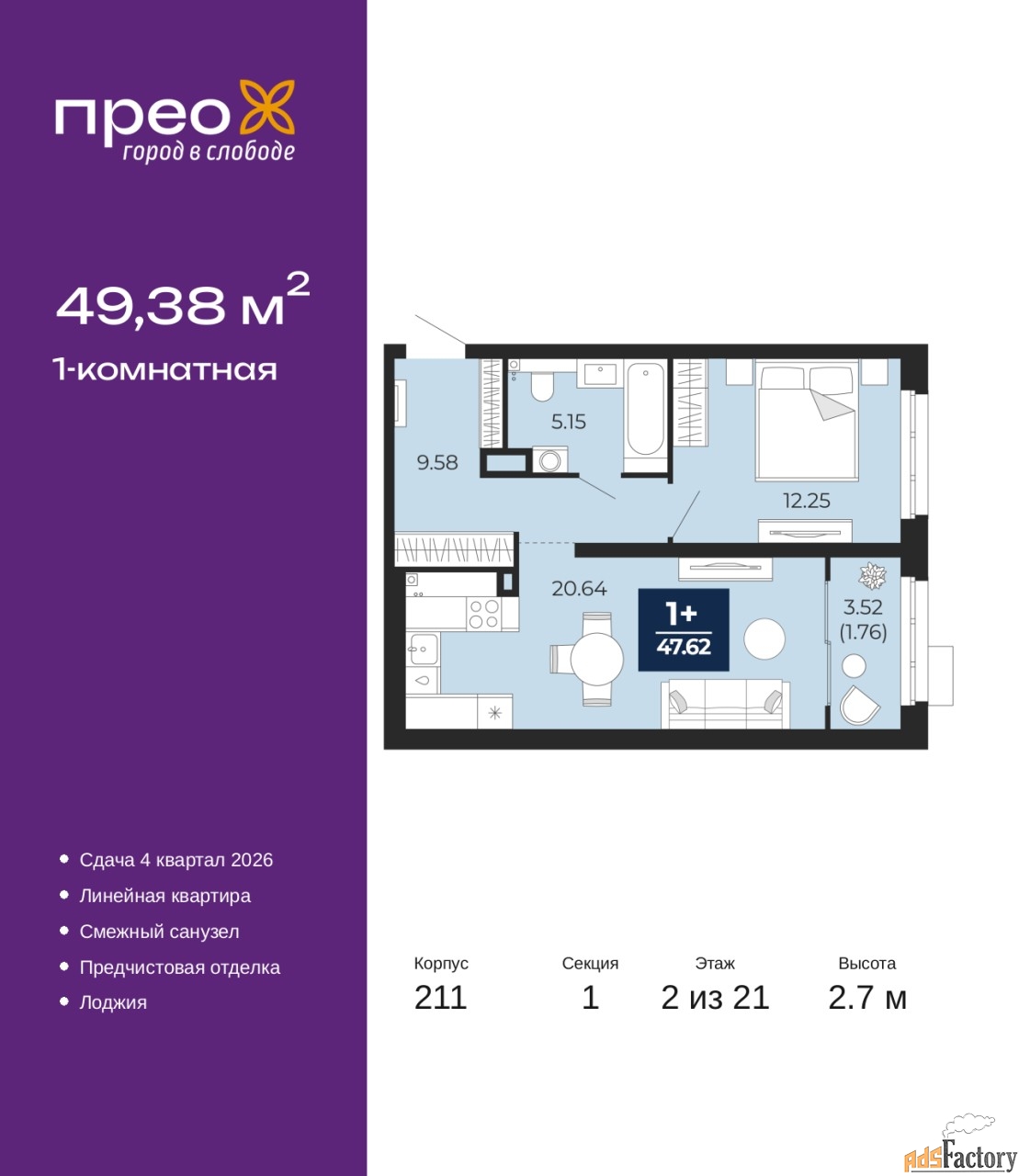 Дом монолитный, черырехподъездный, переменной этажности, от 14 до 21 этажей. Квартира находится в 1-й секции высотой 21 этаж в корпусе 211. На этаже 8 квартир. В подъезде 1 пассажирский и 1 грузовой лифт. Окончание строительства - 4 квартал 2026 года. Оформление сделки по договору долевого участия.