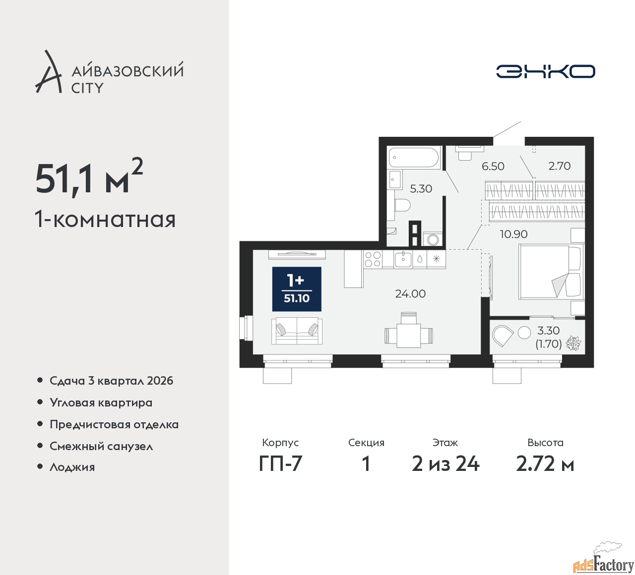 Дом монолитный, многоподъездный, переменной этажности, от 9 до 24 этажей. Квартира находится в 1-й секции высотой 24 этажа в корпусе ГП-7. На этаже 6 квартир. В подъезде 1 пассажирский и 2 грузовых лифта. Окончание строительства - 3 квартал 2026 года. Оформление сделки по договору долевого участия.
