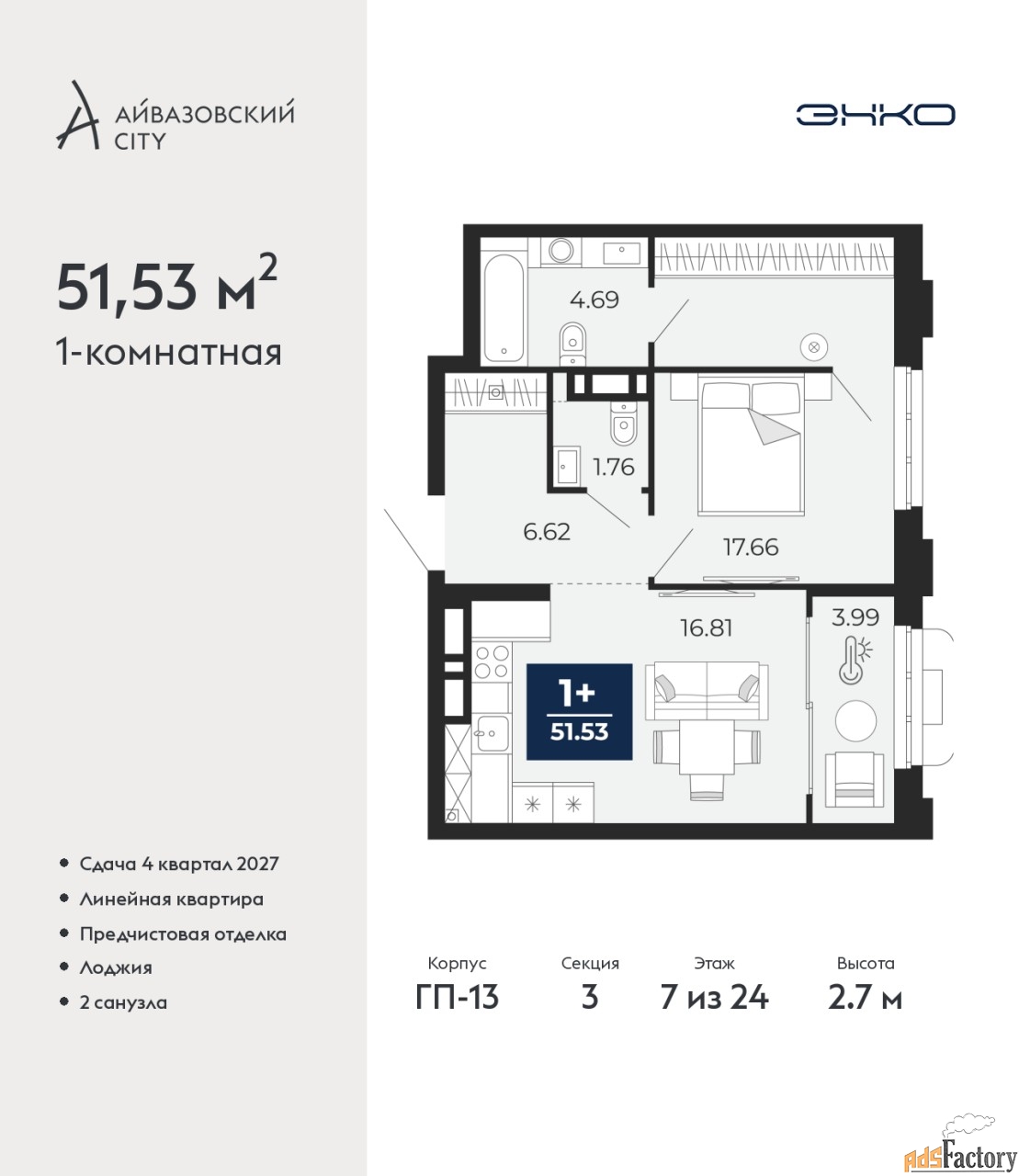 Дом монолитный, многоподъездный, высотой 24 этажа. Квартира находится в 3-й секции в корпусе ГП-13. На этаже 9 квартир. В подъезде 1 пассажирский и 1 грузовой лифт. Окончание строительства - 4 квартал 2027 года. Оформление сделки по договору долевого участия.