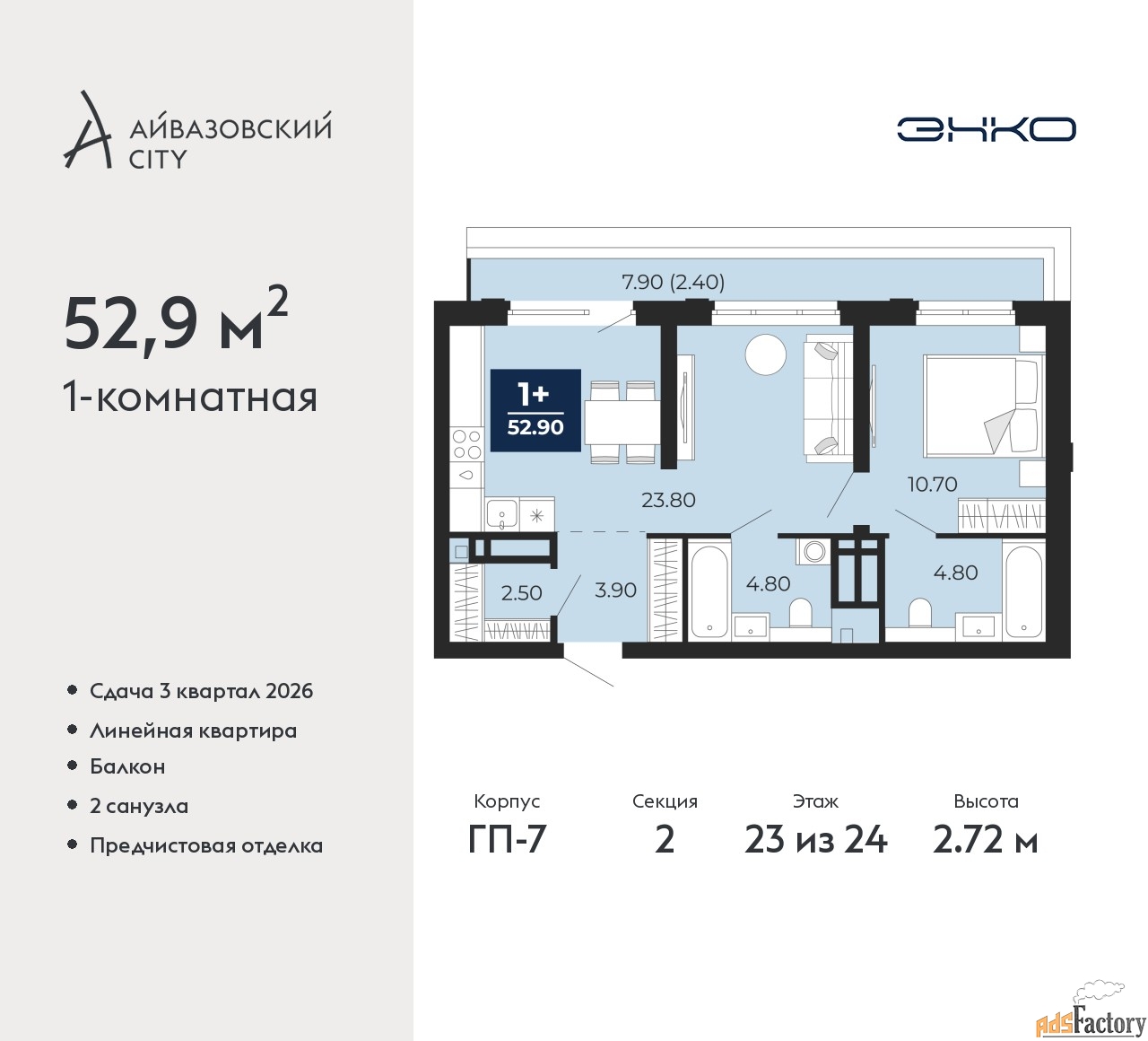 Дом монолитный, многоподъездный, переменной этажности, от 9 до 24 этажей. Квартира находится во 2-й секции высотой 24 этажа в корпусе ГП-7. На этаже 7 квартир. В подъезде 1 пассажирский и 2 грузовых лифта. Окончание строительства - 3 квартал 2026 года. Оформление сделки по договору долевого участия.