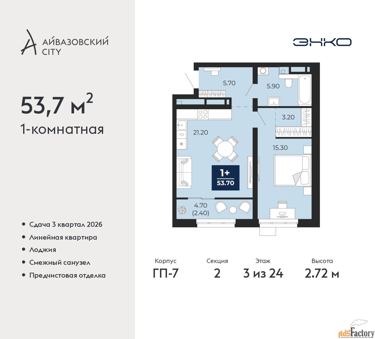 Дом монолитный, многоподъездный, переменной этажности, от 9 до 24 этажей. Квартира находится во 2-й секции высотой 24 этажа в корпусе ГП-7. На этаже 7 квартир. В подъезде 1 пассажирский и 2 грузовых лифта. Окончание строительства - 3 квартал 2026 года. Оформление сделки по договору долевого участия.