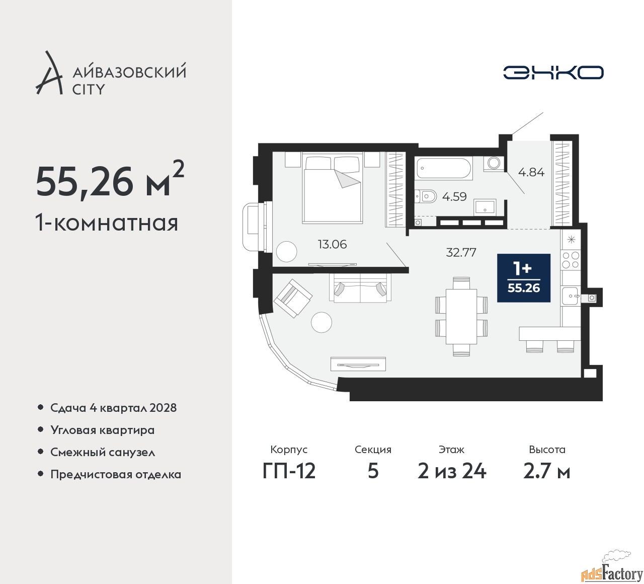 Дом монолитный, многоподъездный, высотой 24 этажа. Квартира находится в 5-й секции в корпусе ГП-12. На этаже 5 квартир. В подъезде 1 пассажирский и 1 грузовой лифт. Окончание строительства - 4 квартал 2028 года. Оформление сделки по договору долевого участия.