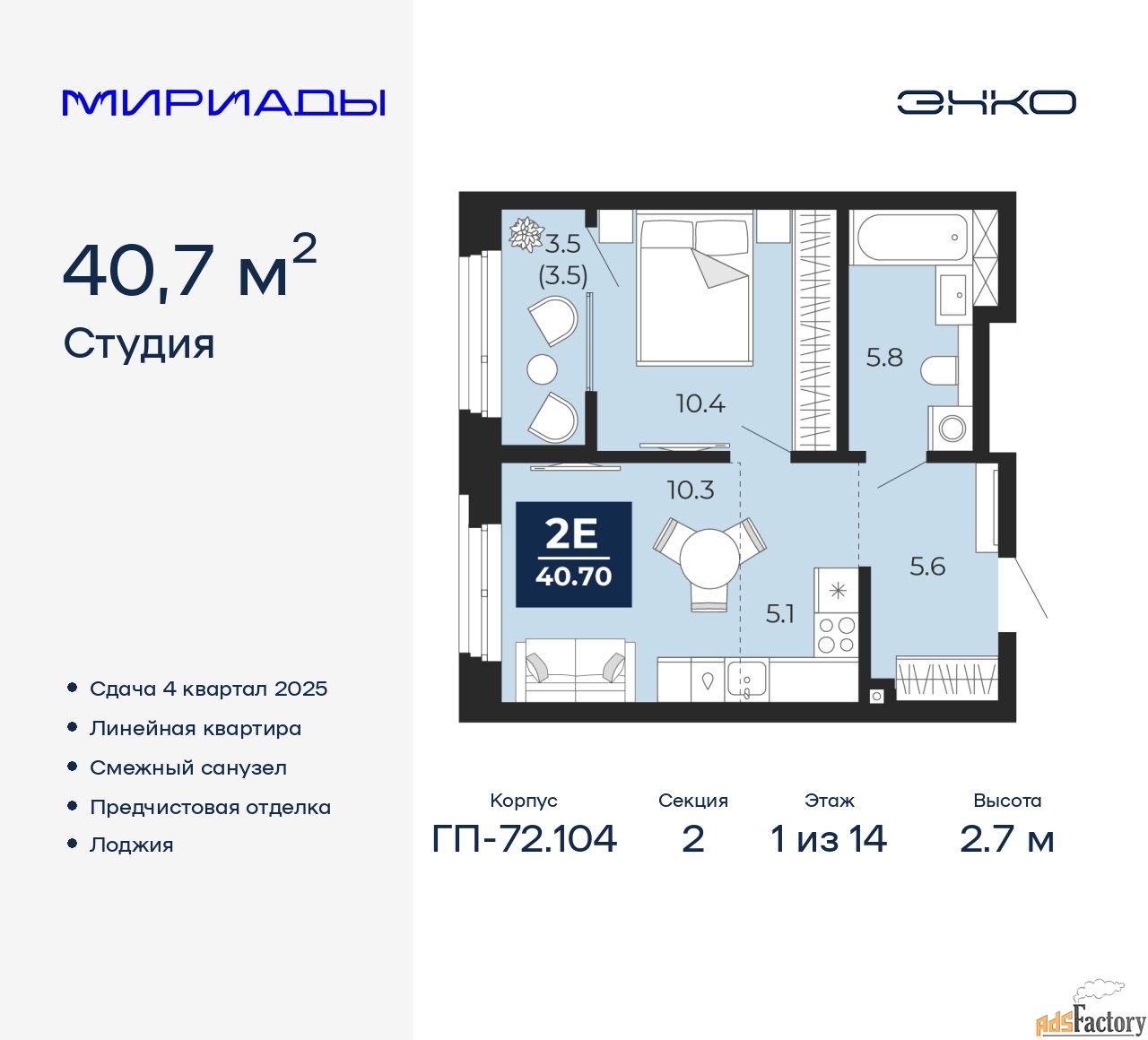 Дом монолитный, двухподъездный, переменной этажности, от 14 до 18 этажей. Квартира находится во 2-й секции высотой 14 этажей в корпусе ГП-72.104. На этаже 8 квартир. В подъезде 1 пассажирский и 1 грузовой лифт. Окончание строительства - 4 квартал 2025 года. Оформление сделки по договору долевого участия.