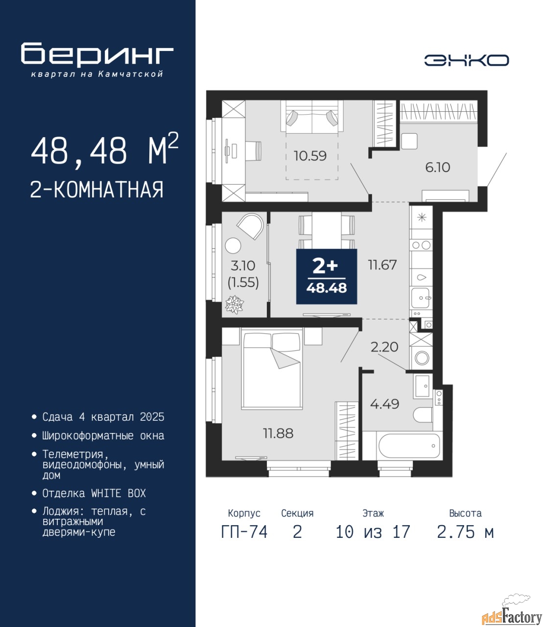 | Высота потолков (м.) | 2.75 |