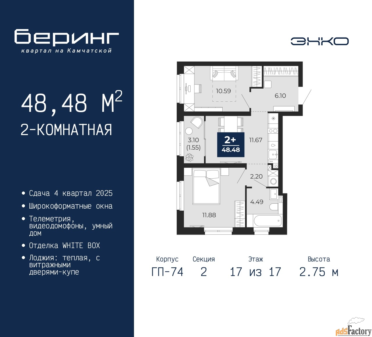 Дом монолитный, многоподъездный, переменной этажности, от 9 до 21 этажей. Квартира находится во 2-й секции высотой 17 этажей в корпусе ГП-74. На этаже 7 квартир. В подъезде 1 пассажирский и 1 грузовой лифт. Окончание строительства - 4 квартал 2025 года. Оформление сделки по договору долевого участия.