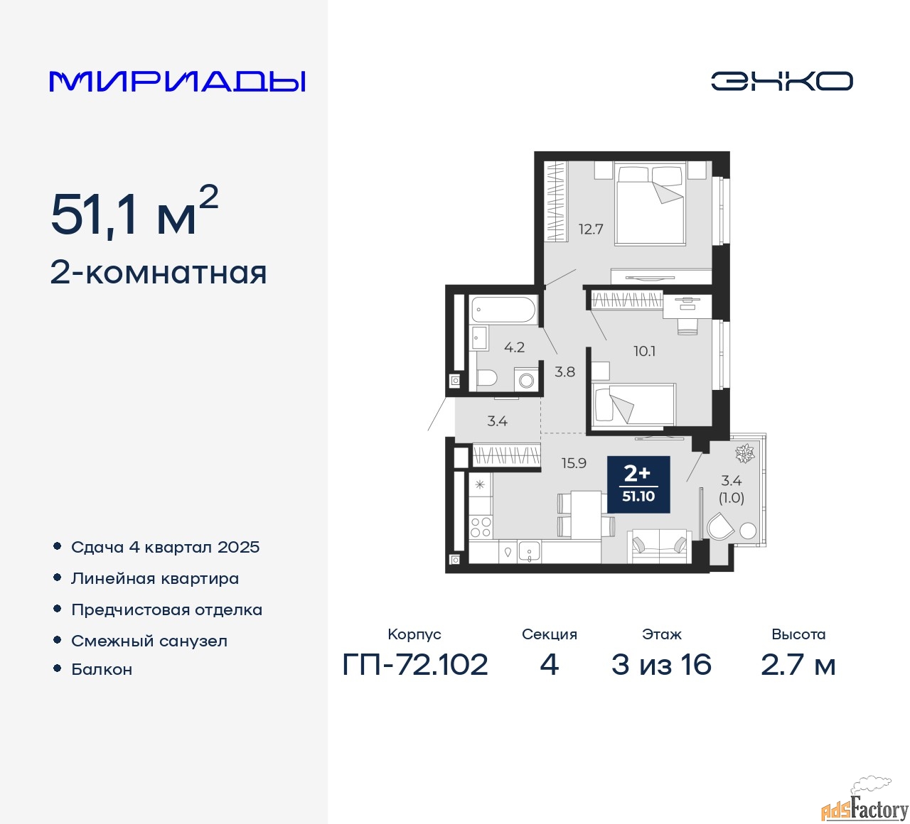 Дом монолитный, многоподъездный, переменной этажности, от 14 до 16 этажей. Квартира находится в 4-й секции высотой 16 этажей в корпусе ГП-72.102. На этаже 6 квартир. В подъезде 1 пассажирский и 1 грузовой лифт. Окончание строительства - 4 квартал 2025 года. Оформление сделки по договору долевого участия.