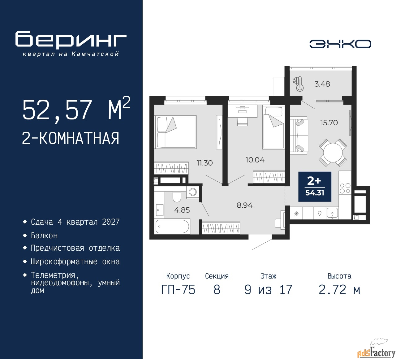 Дом монолитный, многоподъездный, переменной этажности, от 17 до 24 этажей. Квартира находится в 8-й секции высотой 17 этажей в корпусе ГП-75. На этаже 8 квартир. В подъезде 2 пассажирских и 1 грузовой лифт. Окончание строительства - 4 квартал 2027 года. Оформление сделки по договору долевого участия.