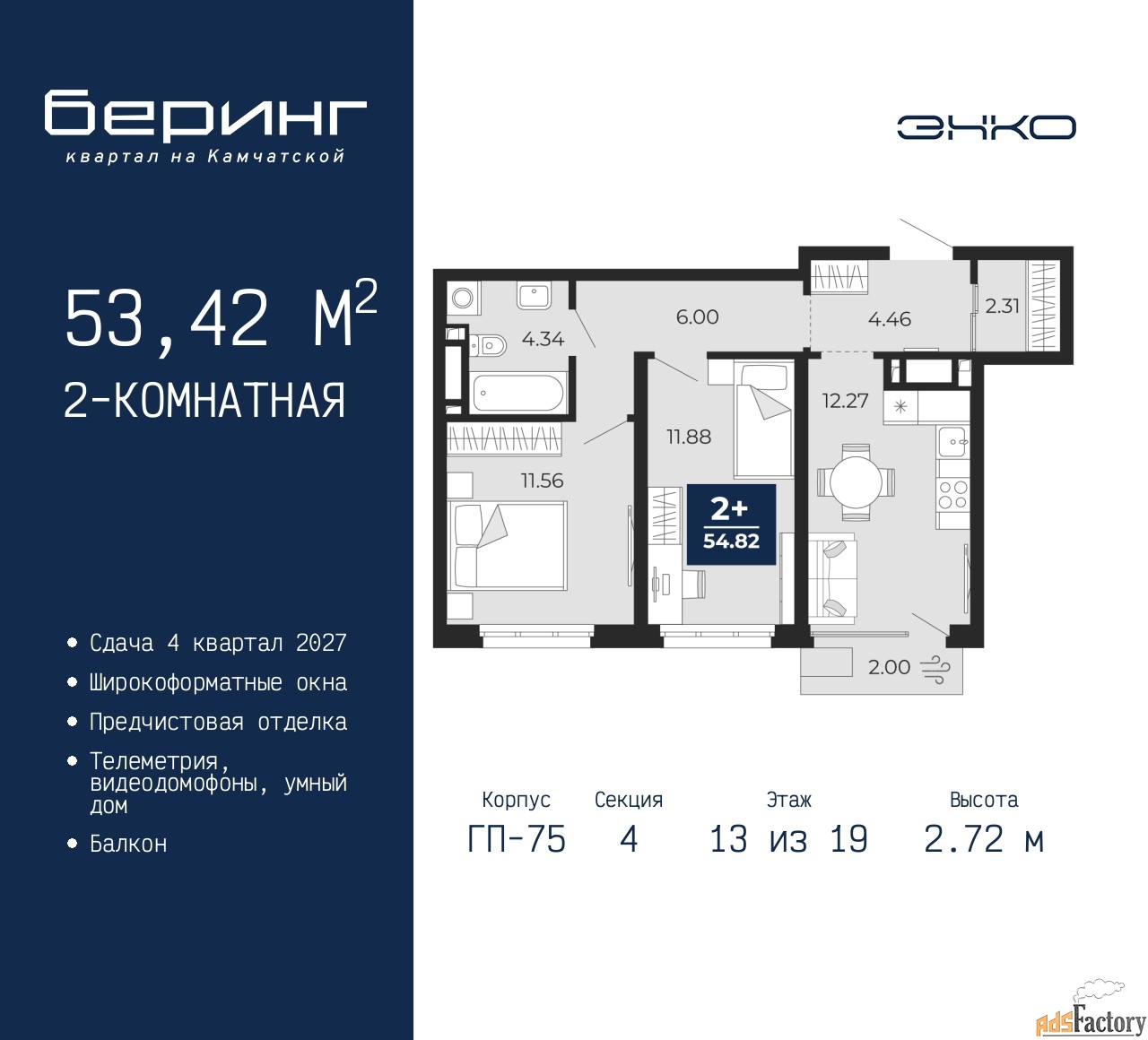 | Высота потолков (м.) | 2.72 |