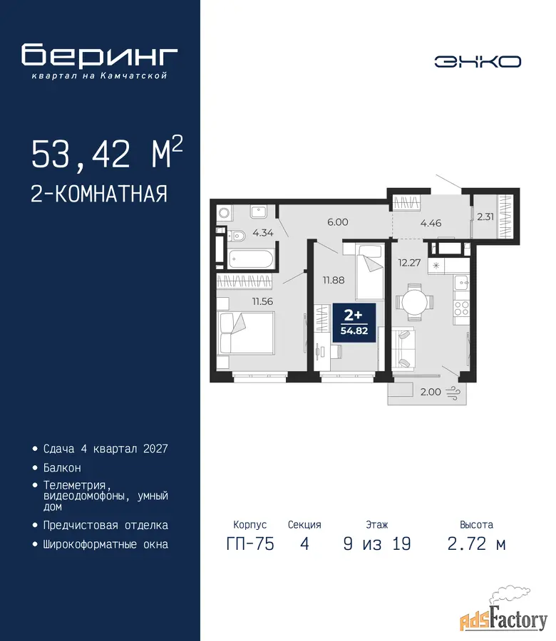 | Высота потолков (м.) | 2.72 |