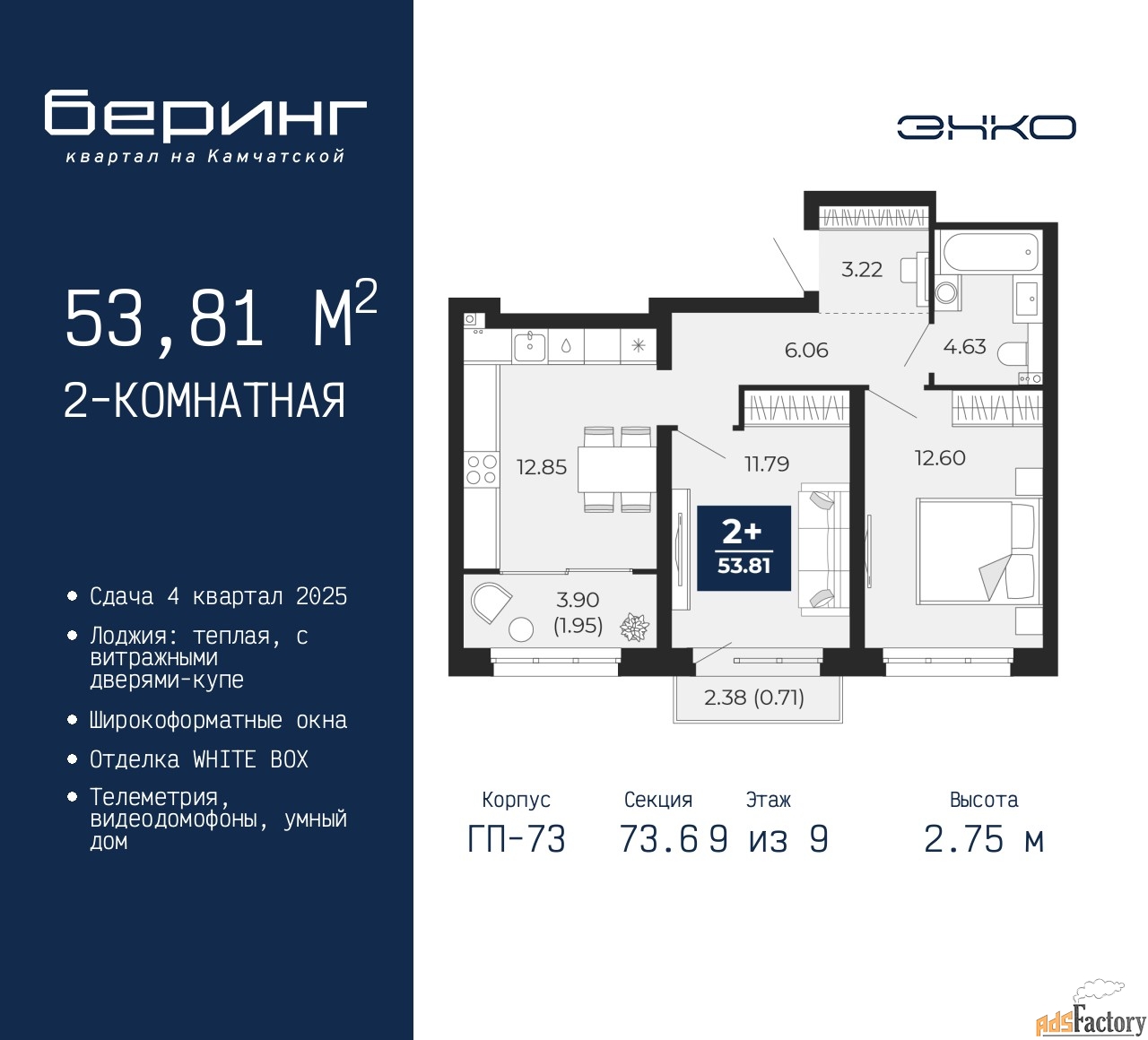 Дом монолитный, многоподъездный, переменной этажности, от 9 до 22 этажей. Квартира находится в 73.6-й секции высотой 9 этажей в корпусе ГП-73. На этаже 5 квартир. В подъезде 1 пассажирский и 1 грузовой лифт. Окончание строительства - 4 квартал 2025 года. Оформление сделки по договору долевого участия.