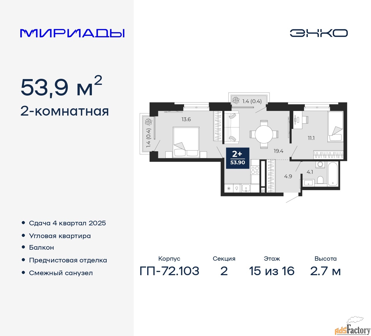 Дом монолитный, трехподъездный, переменной этажности, от 14 до 16 этажей. Квартира находится во 2-й секции высотой 16 этажей в корпусе ГП-72.103. На этаже 6 квартир. В подъезде 1 пассажирский и 1 грузовой лифт. Окончание строительства - 4 квартал 2025 года. Оформление сделки по договору долевого участия.