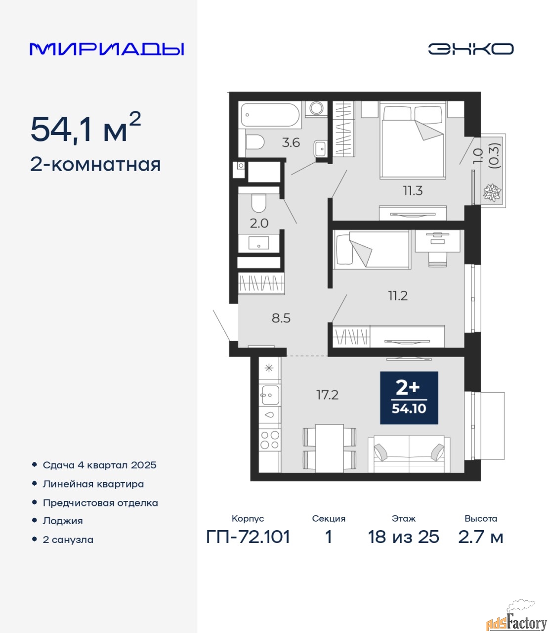 Квартира находится в корпусе ГП-72.101. Дом монолитный, одноподъездный, высотой 25 этажей. На этаже 8 квартир. В подъезде 2 пассажирских и 1 грузовой лифт. Окончание строительства - 1 квартал 2026 года. Оформление сделки по договору долевого участия.
