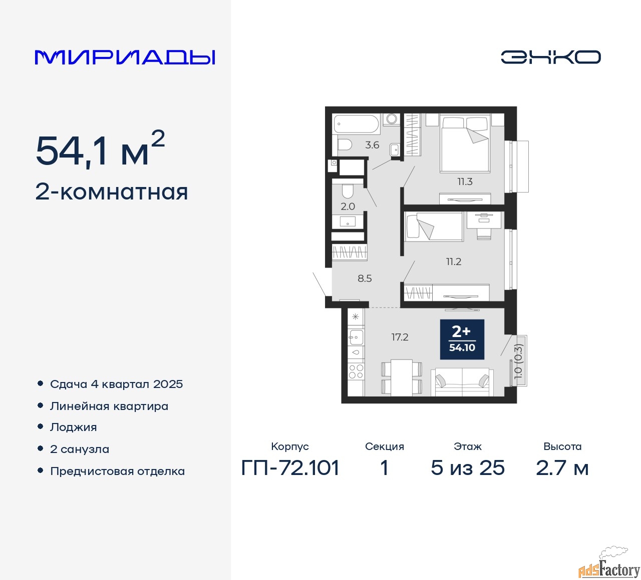 Квартира находится в корпусе ГП-72.101. Дом монолитный, одноподъездный, высотой 25 этажей. На этаже 8 квартир. В подъезде 2 пассажирских и 1 грузовой лифт. Окончание строительства - 4 квартал 2025 года. Оформление сделки по договору долевого участия.