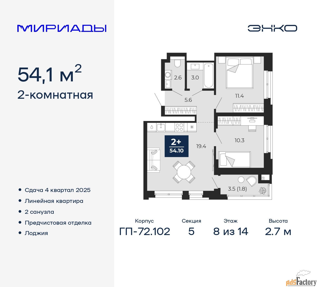 | Общая площадь (кв.м) | 54.1 |