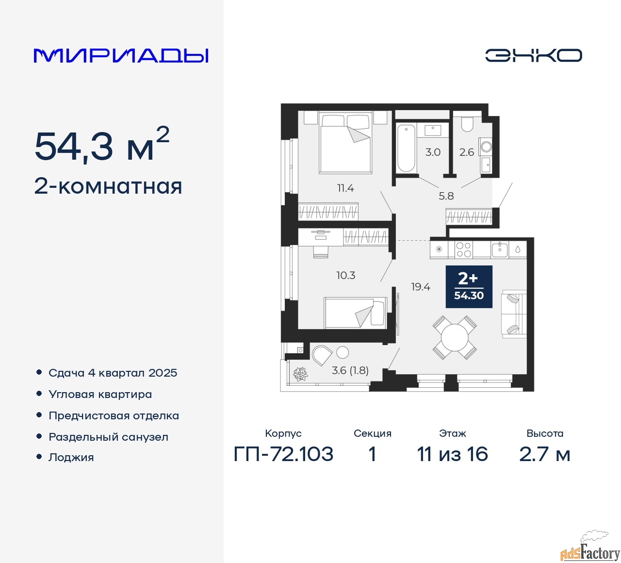 | Общая площадь (кв.м) | 54.3 |