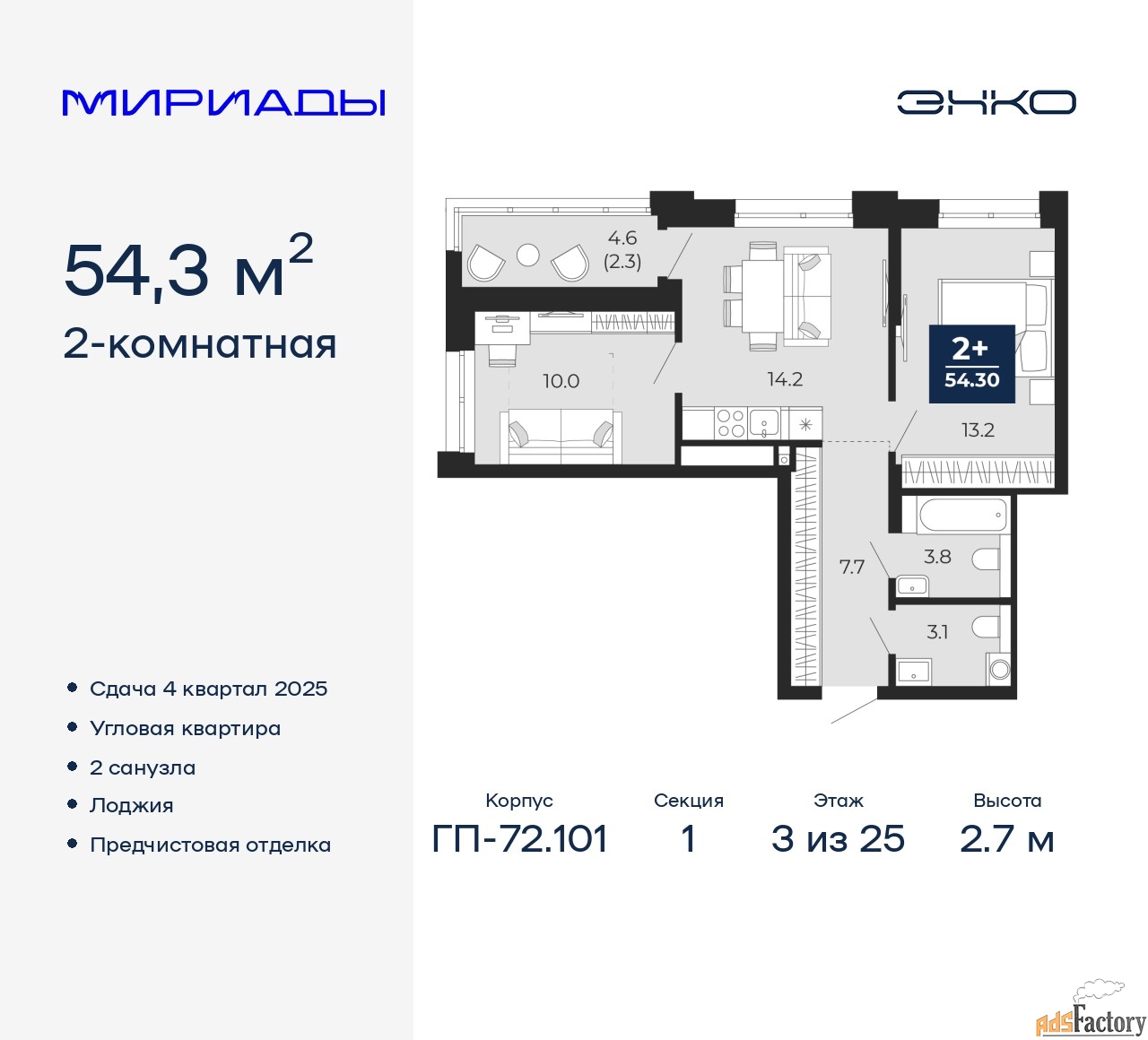 Квартира находится в корпусе ГП-72.101. Дом монолитный, одноподъездный, высотой 25 этажей. На этаже 8 квартир. В подъезде 2 пассажирских и 1 грузовой лифт. Окончание строительства - 4 квартал 2025 года. Оформление сделки по договору долевого участия.
