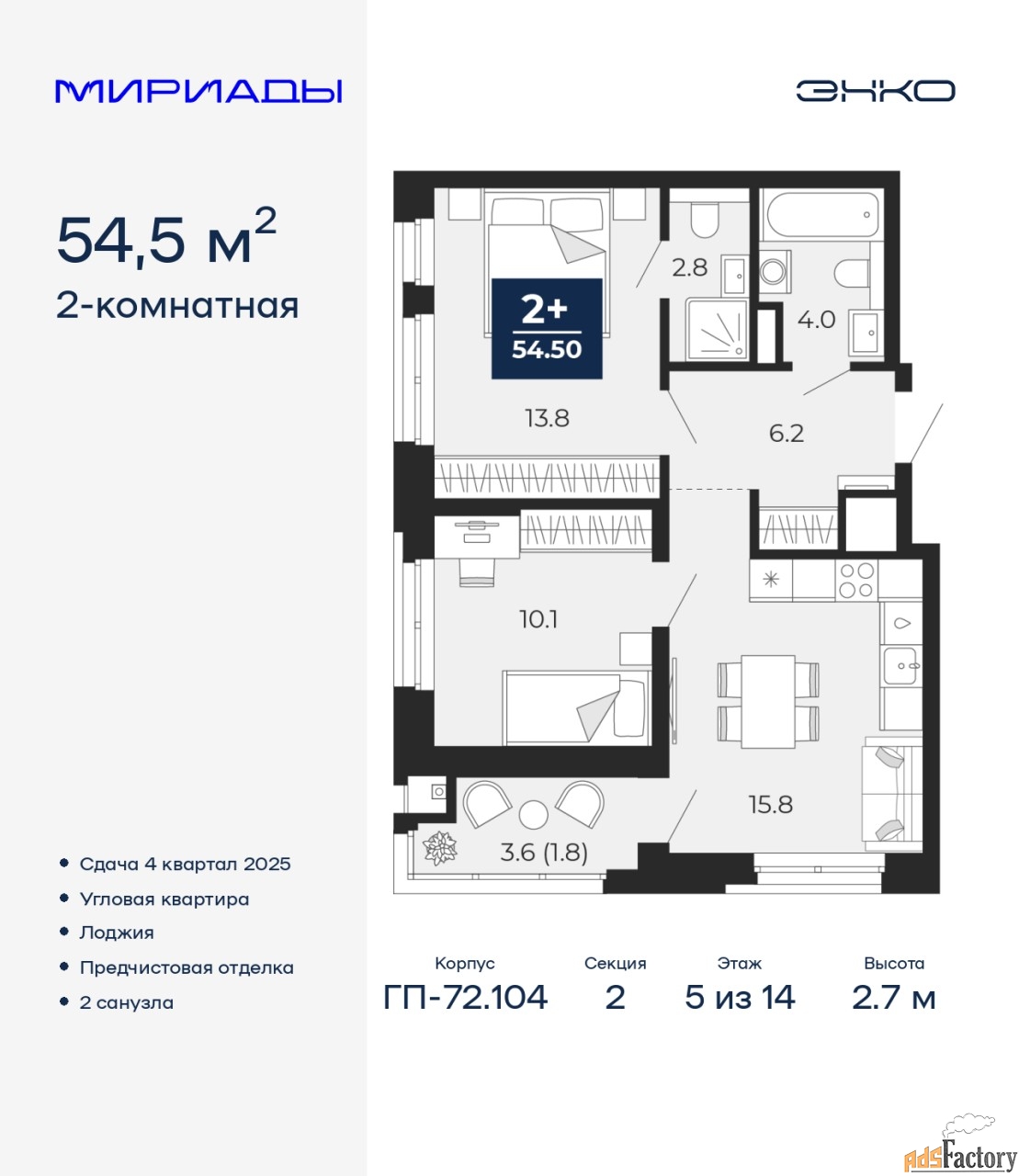 Дом монолитный, двухподъездный, переменной этажности, от 14 до 18 этажей. Квартира находится во 2-й секции высотой 14 этажей в корпусе ГП-72.104. На этаже 8 квартир. В подъезде 1 пассажирский и 1 грузовой лифт. Окончание строительства - 1 квартал 2026 года. Оформление сделки по договору долевого участия.
