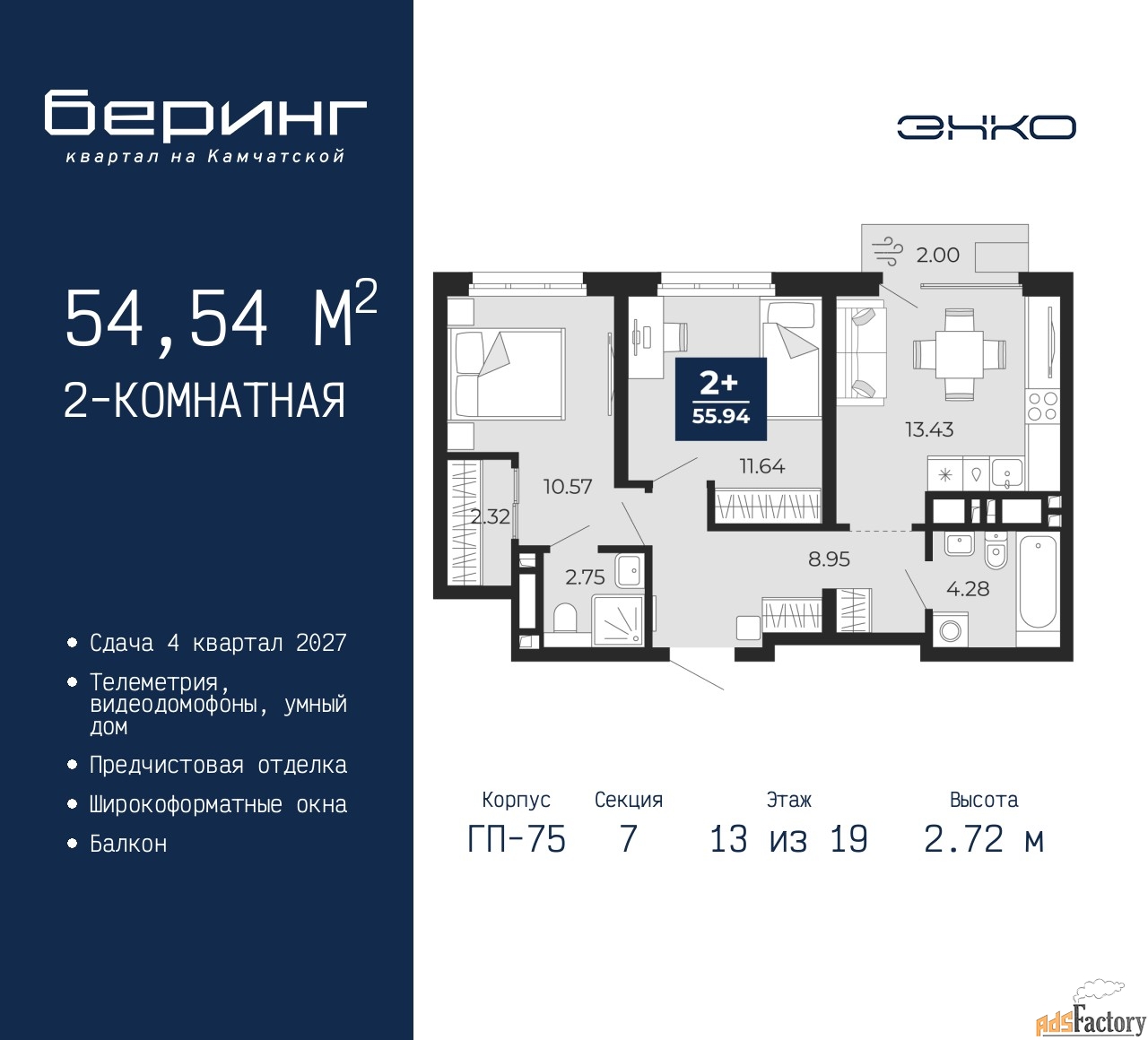Дом монолитный, многоподъездный, переменной этажности, от 17 до 24 этажей. Квартира находится в 7-й секции высотой 19 этажей в корпусе ГП-75. На этаже 7 квартир. В подъезде 2 пассажирских и 1 грузовой лифт. Окончание строительства - 4 квартал 2027 года. Оформление сделки по договору долевого участия.