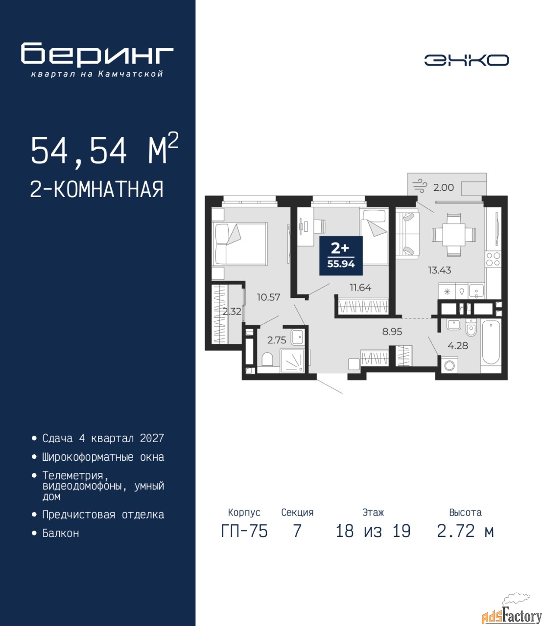 Дом монолитный, многоподъездный, переменной этажности, от 17 до 24 этажей. Квартира находится в 7-й секции высотой 19 этажей в корпусе ГП-75. На этаже 7 квартир. В подъезде 2 пассажирских и 1 грузовой лифт. Окончание строительства - 4 квартал 2027 года. Оформление сделки по договору долевого участия.