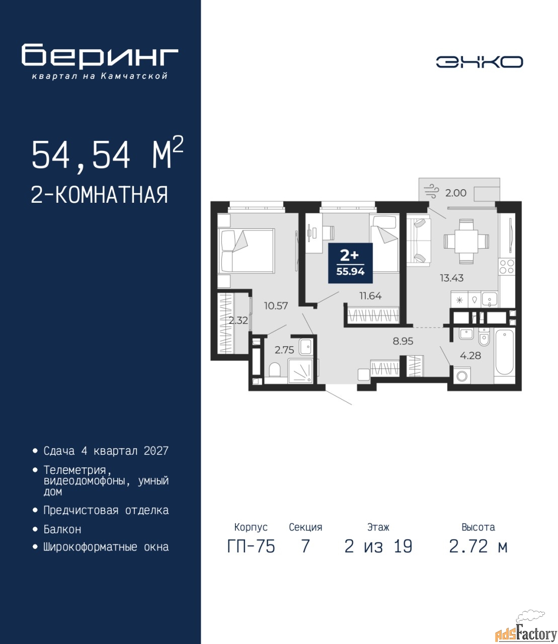 Дом монолитный, многоподъездный, переменной этажности, от 17 до 24 этажей. Квартира находится в 7-й секции высотой 19 этажей в корпусе ГП-75. На этаже 7 квартир. В подъезде 2 пассажирских и 1 грузовой лифт. Окончание строительства - 4 квартал 2027 года. Оформление сделки по договору долевого участия.