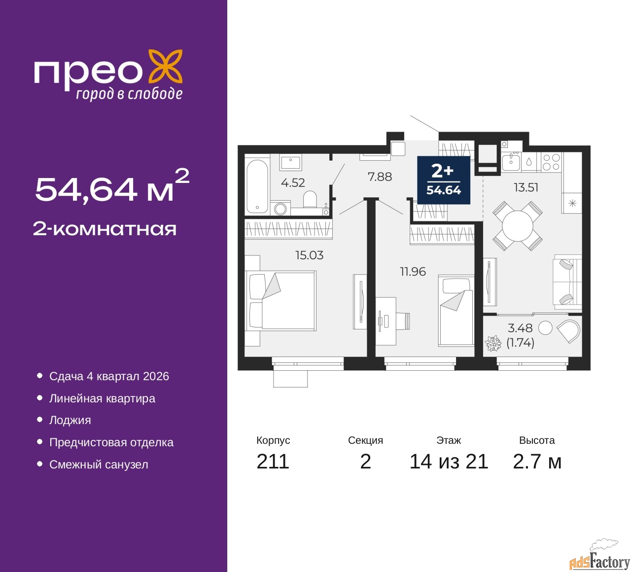 Дом монолитный, черырехподъездный, переменной этажности, от 14 до 21 этажей. Квартира находится во 2-й секции высотой 21 этаж в корпусе 211. На этаже 10 квартир. В подъезде 1 пассажирский и 1 грузовой лифт. Окончание строительства - 4 квартал 2026 года. Оформление сделки по договору долевого участия.