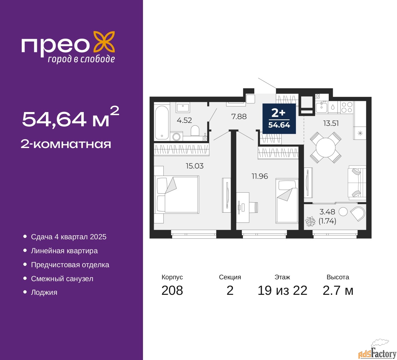 Дом монолитный, трехподъездный, переменной этажности, от 14 до 22 этажей. Квартира находится во 2-й секции высотой 22 этажа в корпусе 208. На этаже 10 квартир. В подъезде 1 пассажирский и 1 грузовой лифт. Окончание строительства - 4 квартал 2025 года. Оформление сделки по договору долевого участия.