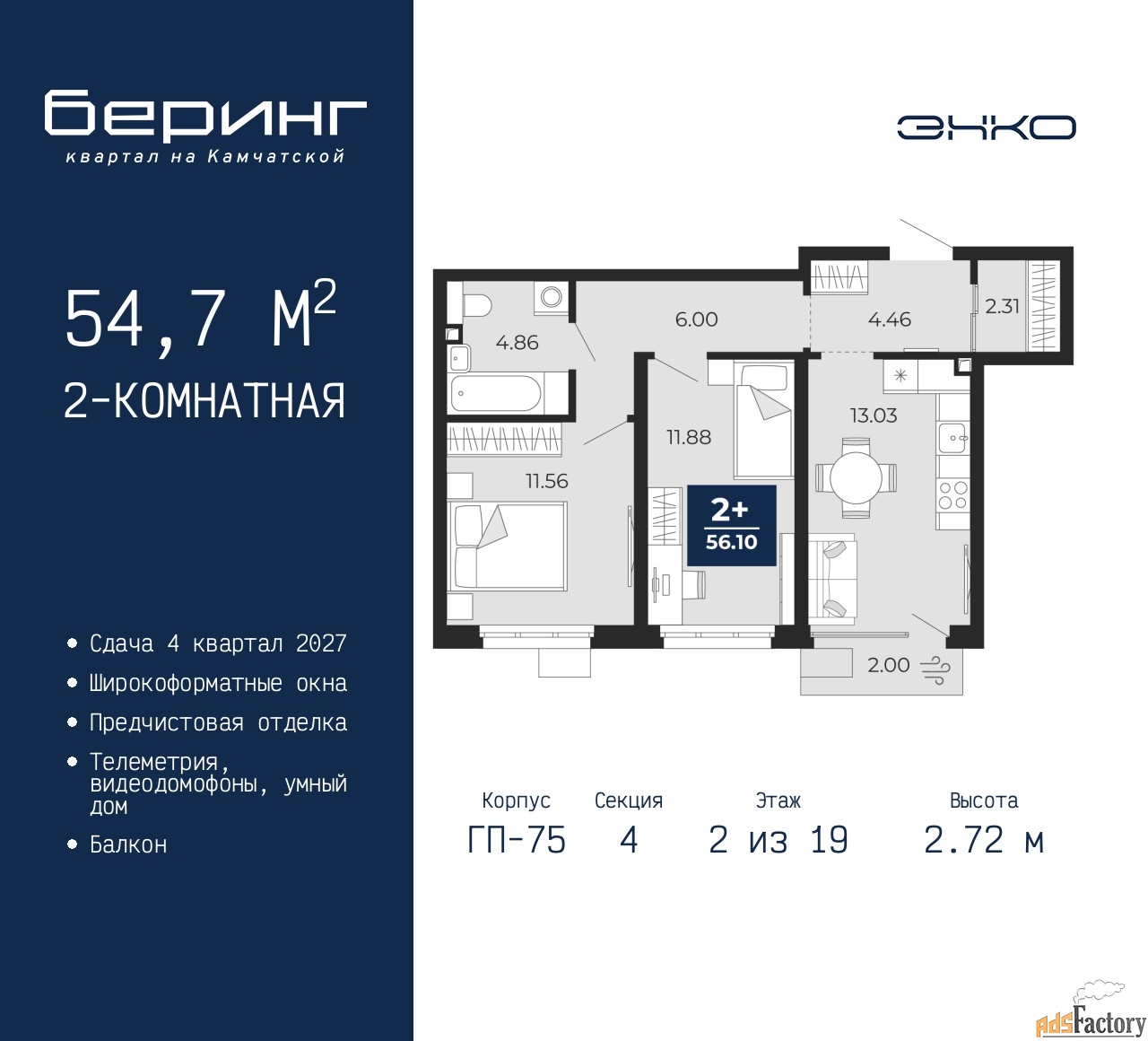 Дом монолитный, многоподъездный, переменной этажности, от 17 до 24 этажей. Квартира находится в 4-й секции высотой 19 этажей в корпусе ГП-75. На этаже 4 квартиры. В подъезде 2 пассажирских и 1 грузовой лифт. Окончание строительства - 4 квартал 2027 года. Оформление сделки по договору долевого участия.