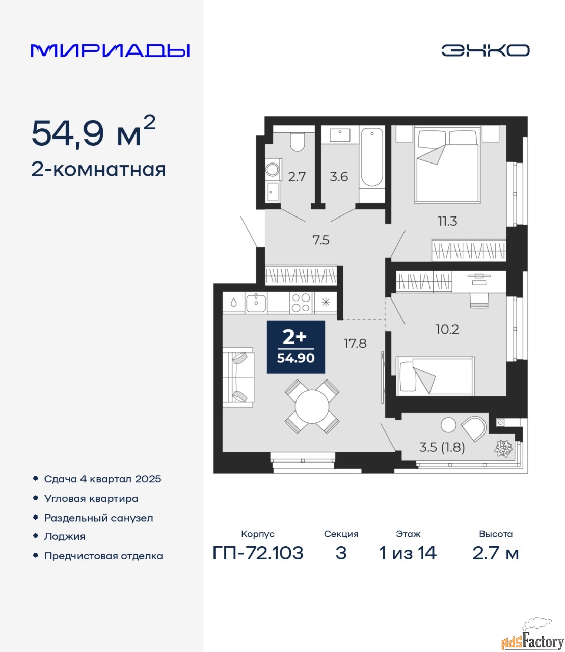 Дом монолитный, трехподъездный, переменной этажности, от 14 до 16 этажей. Квартира находится в 3-й секции высотой 14 этажей в корпусе ГП-72.103. На этаже 8 квартир. В подъезде 1 пассажирский и 1 грузовой лифт. Окончание строительства - 1 квартал 2026 года. Оформление сделки по договору долевого участия.
