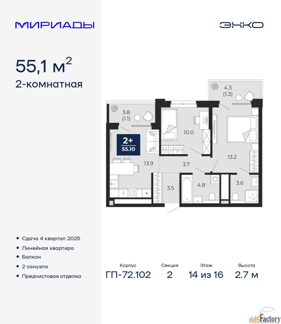Дом монолитный, многоподъездный, переменной этажности, от 14 до 16 этажей. Квартира находится во 2-й секции высотой 16 этажей в корпусе ГП-72.102. На этаже 6 квартир. В подъезде 1 пассажирский и 1 грузовой лифт. Окончание строительства - 1 квартал 2026 года. Оформление сделки по договору долевого участия.