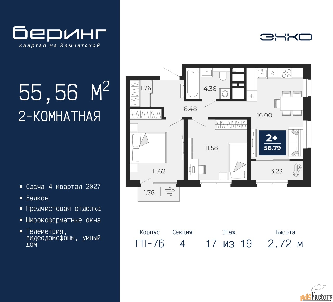 Дом монолитный, черырехподъездный, переменной этажности, от 19 до 24 этажей. Квартира находится в 4-й секции высотой 19 этажей в корпусе ГП-76. На этаже 5 квартир. В подъезде 1 пассажирский и 1 грузовой лифт. Окончание строительства - 4 квартал 2027 года. Оформление сделки по договору долевого участия.