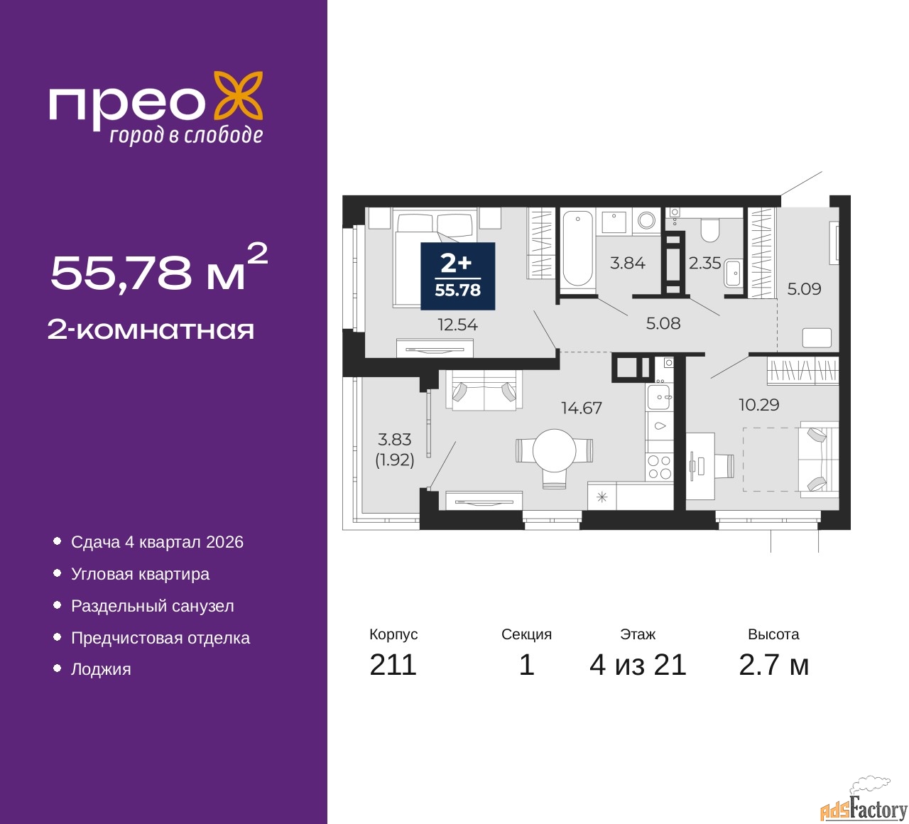 Дом монолитный, черырехподъездный, переменной этажности, от 14 до 21 этажей. Квартира находится в 1-й секции высотой 21 этаж в корпусе 211. На этаже 8 квартир. В подъезде 1 пассажирский и 1 грузовой лифт. Окончание строительства - 4 квартал 2026 года. Оформление сделки по договору долевого участия.