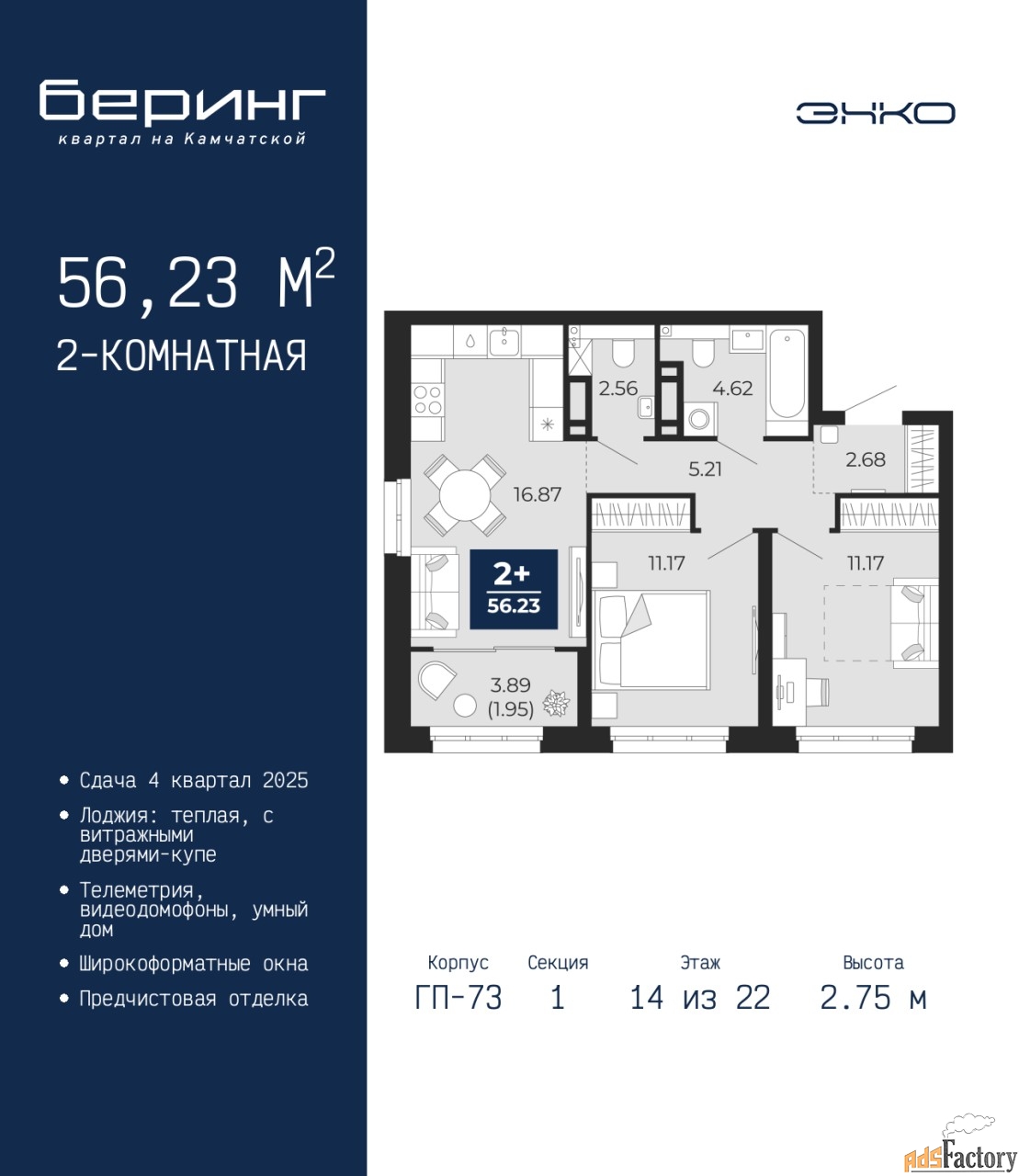 Дом монолитный, многоподъездный, переменной этажности, от 9 до 22 этажей. Квартира находится в 1-й секции высотой 22 этажа в корпусе ГП-73. На этаже 5 квартир. В подъезде 1 пассажирский и 1 грузовой лифт. Окончание строительства - 1 квартал 2026 года. Оформление сделки по договору долевого участия.