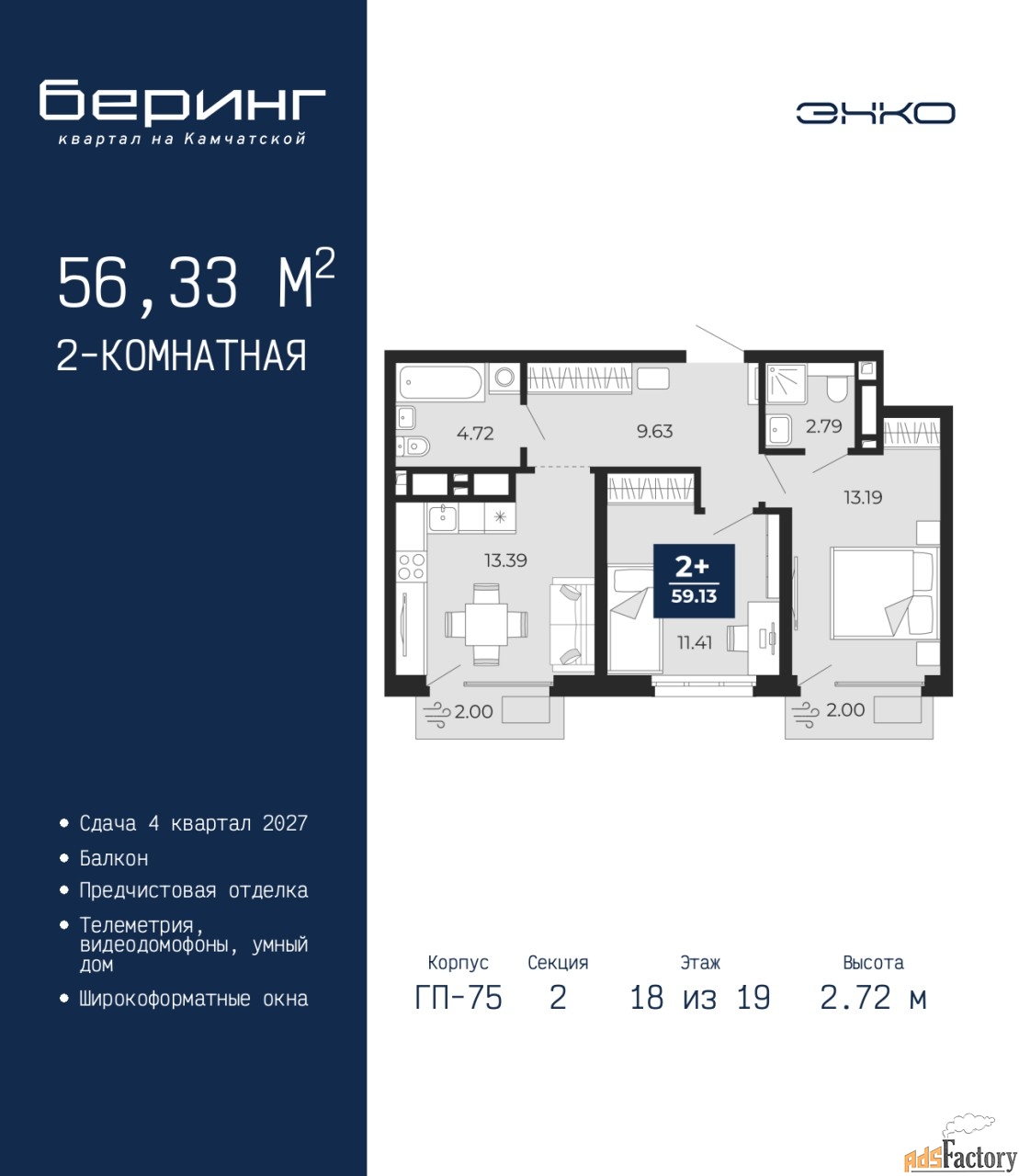 | Высота потолков (м.) | 2.72 |