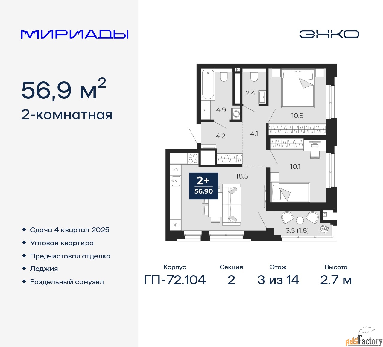 Дом монолитный, двухподъездный, переменной этажности, от 14 до 18 этажей. Квартира находится во 2-й секции высотой 14 этажей в корпусе ГП-72.104. На этаже 8 квартир. В подъезде 1 пассажирский и 1 грузовой лифт. Окончание строительства - 4 квартал 2025 года. Оформление сделки по договору долевого участия.