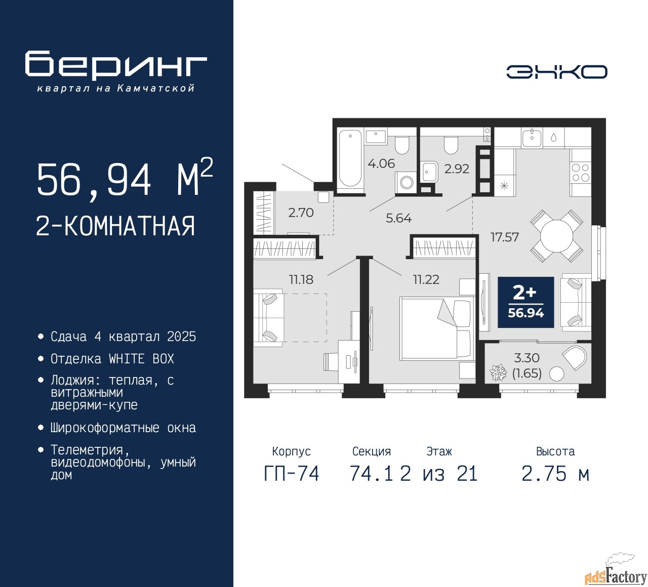 Дом монолитный, многоподъездный, переменной этажности, от 9 до 21 этажей. Квартира находится в 74.1-й секции высотой 21 этаж в корпусе ГП-74. На этаже 5 квартир. В подъезде 1 грузовой лифт. Окончание строительства - 4 квартал 2025 года. Оформление сделки по договору долевого участия.
