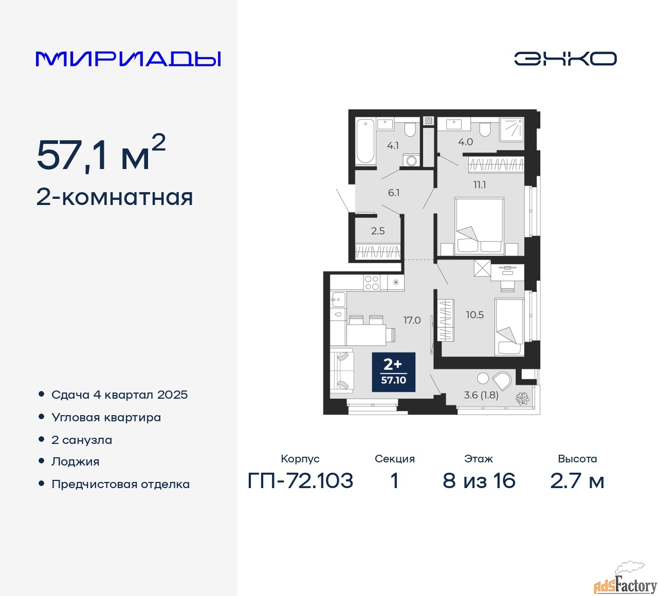 Дом монолитный, трехподъездный, переменной этажности, от 14 до 16 этажей. Квартира находится в 1-й секции высотой 16 этажей в корпусе ГП-72.103. На этаже 8 квартир. В подъезде 1 пассажирский и 1 грузовой лифт. Окончание строительства - 4 квартал 2025 года. Оформление сделки по договору долевого участия.