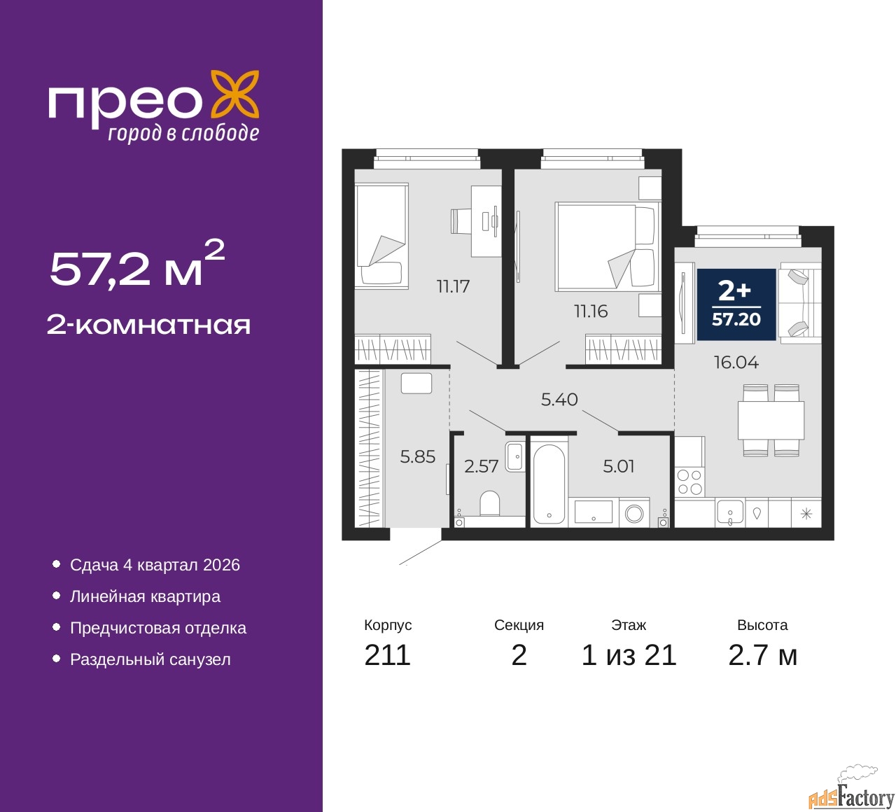 | Общая площадь (кв.м) | 57.2 |
