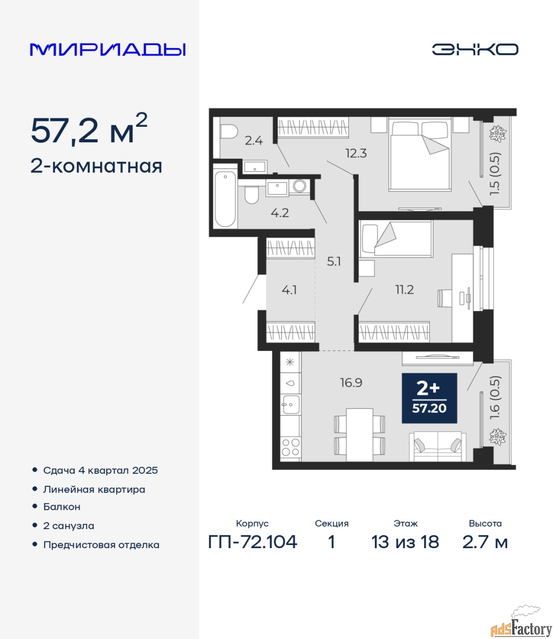 Дом монолитный, двухподъездный, переменной этажности, от 14 до 18 этажей. Квартира находится в 1-й секции высотой 18 этажей в корпусе ГП-72.104. На этаже 6 квартир. В подъезде 1 пассажирский и 1 грузовой лифт. Окончание строительства - 1 квартал 2026 года. Оформление сделки по договору долевого участия.