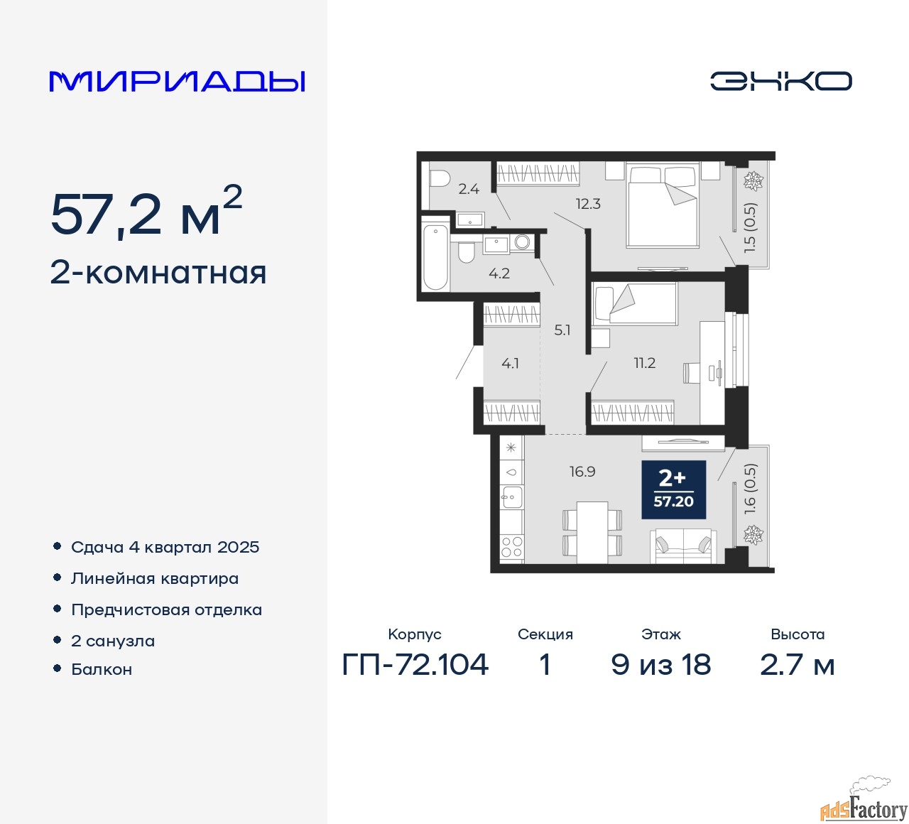 Дом монолитный, двухподъездный, переменной этажности, от 14 до 18 этажей. Квартира находится в 1-й секции высотой 18 этажей в корпусе ГП-72.104. На этаже 6 квартир. В подъезде 1 пассажирский и 1 грузовой лифт. Окончание строительства - 4 квартал 2025 года. Оформление сделки по договору долевого участия.