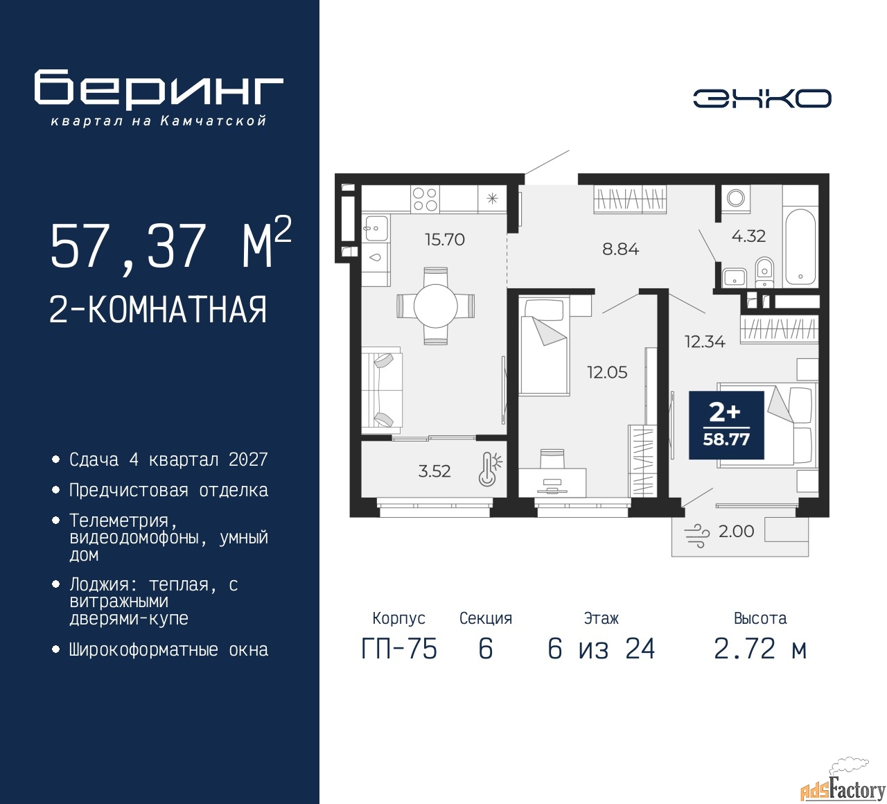 Дом монолитный, многоподъездный, переменной этажности, от 17 до 24 этажей. Квартира находится в 6-й секции высотой 24 этажа в корпусе ГП-75. На этаже 6 квартир. В подъезде 2 пассажирских и 1 грузовой лифт. Окончание строительства - 4 квартал 2027 года. Оформление сделки по договору долевого участия.