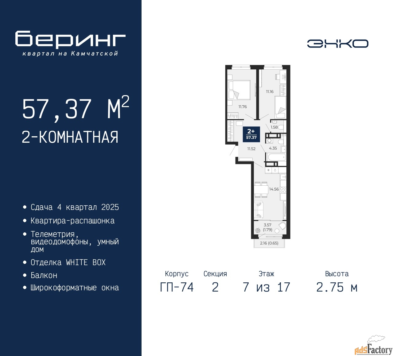 Дом монолитный, многоподъездный, переменной этажности, от 9 до 21 этажей. Квартира находится во 2-й секции высотой 17 этажей в корпусе ГП-74. На этаже 7 квартир. В подъезде 1 пассажирский и 1 грузовой лифт. Окончание строительства - 4 квартал 2025 года. Оформление сделки по договору долевого участия.