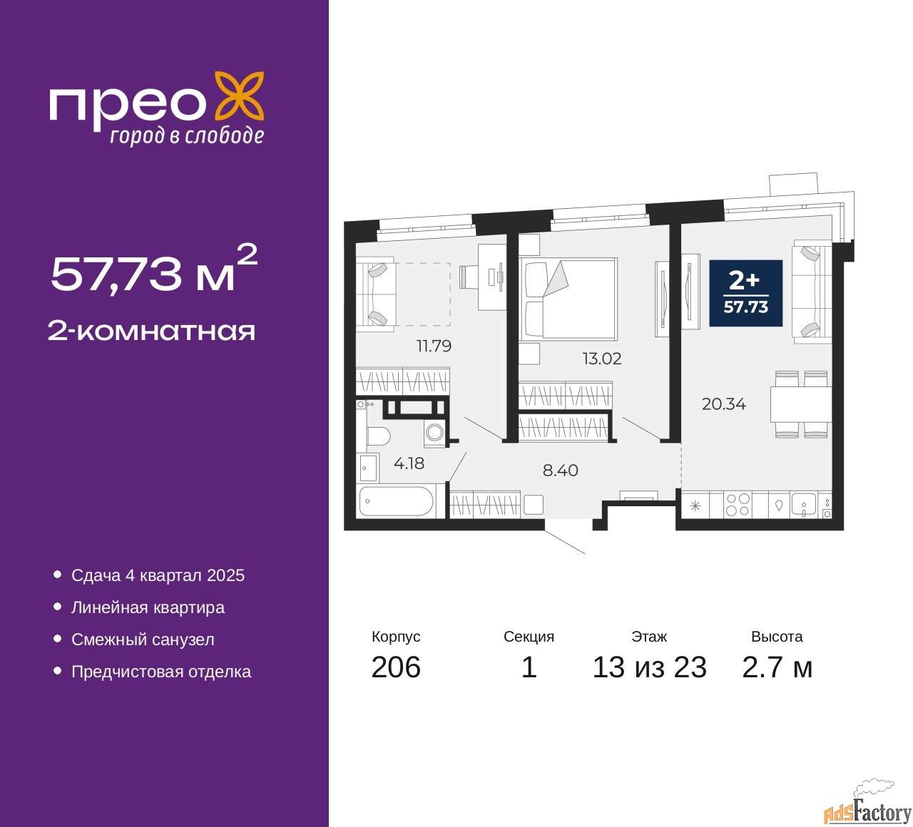 | Общая площадь (кв.м) | 57.73 |
